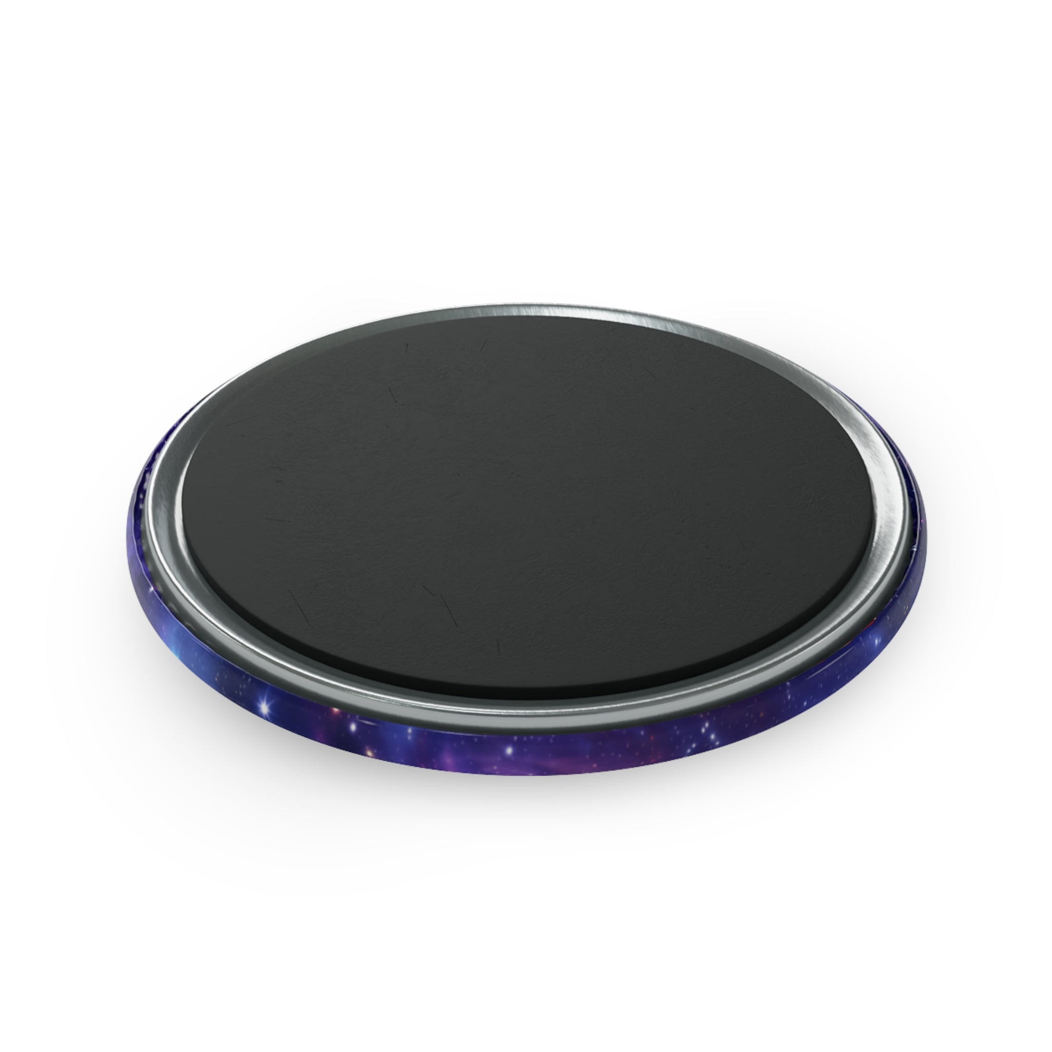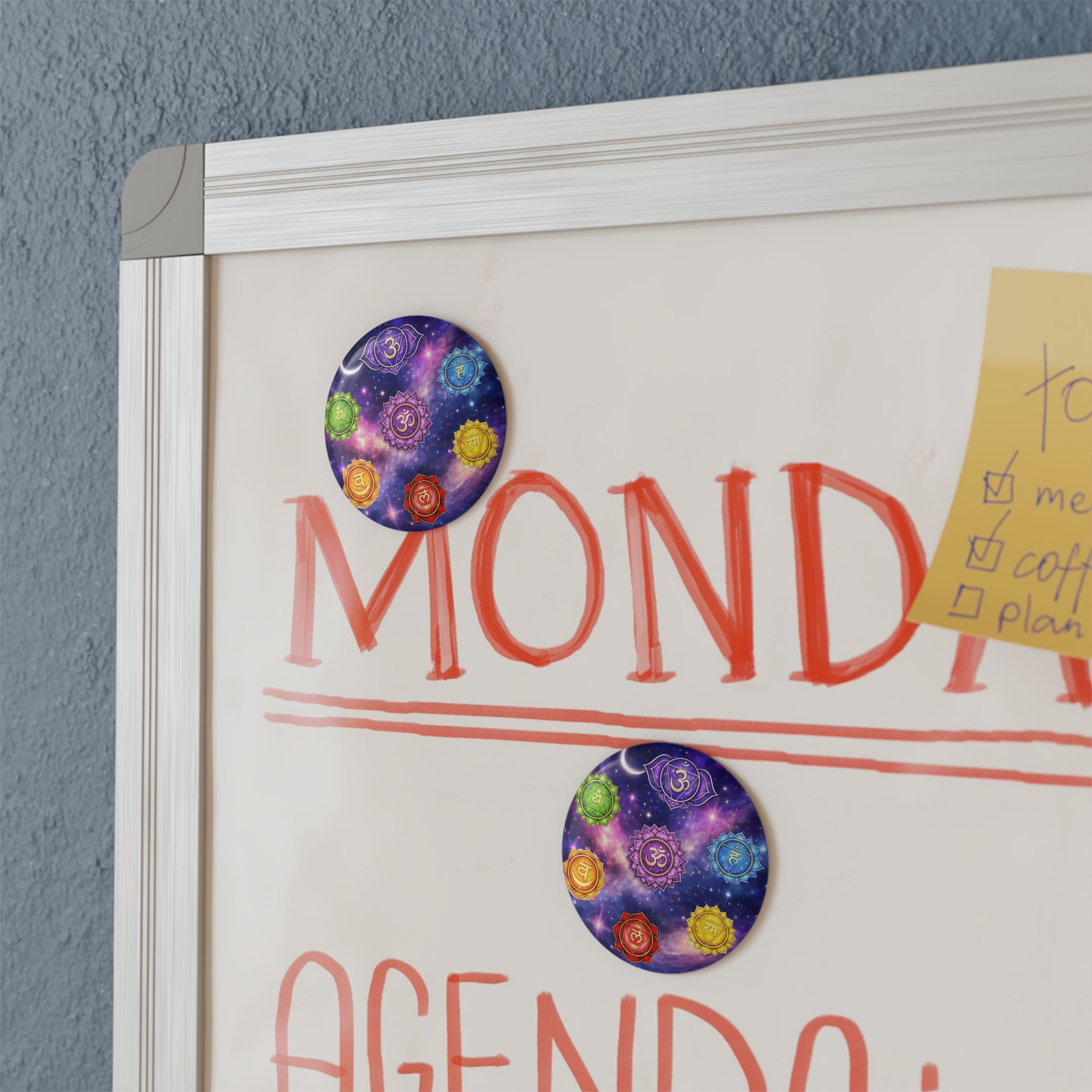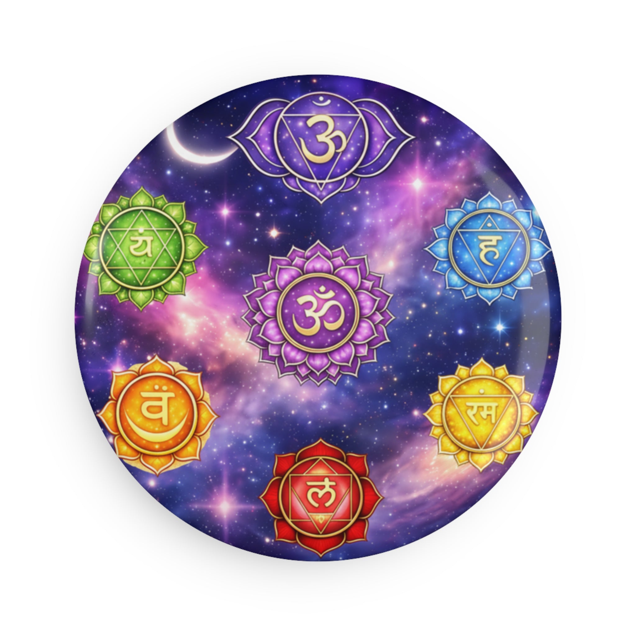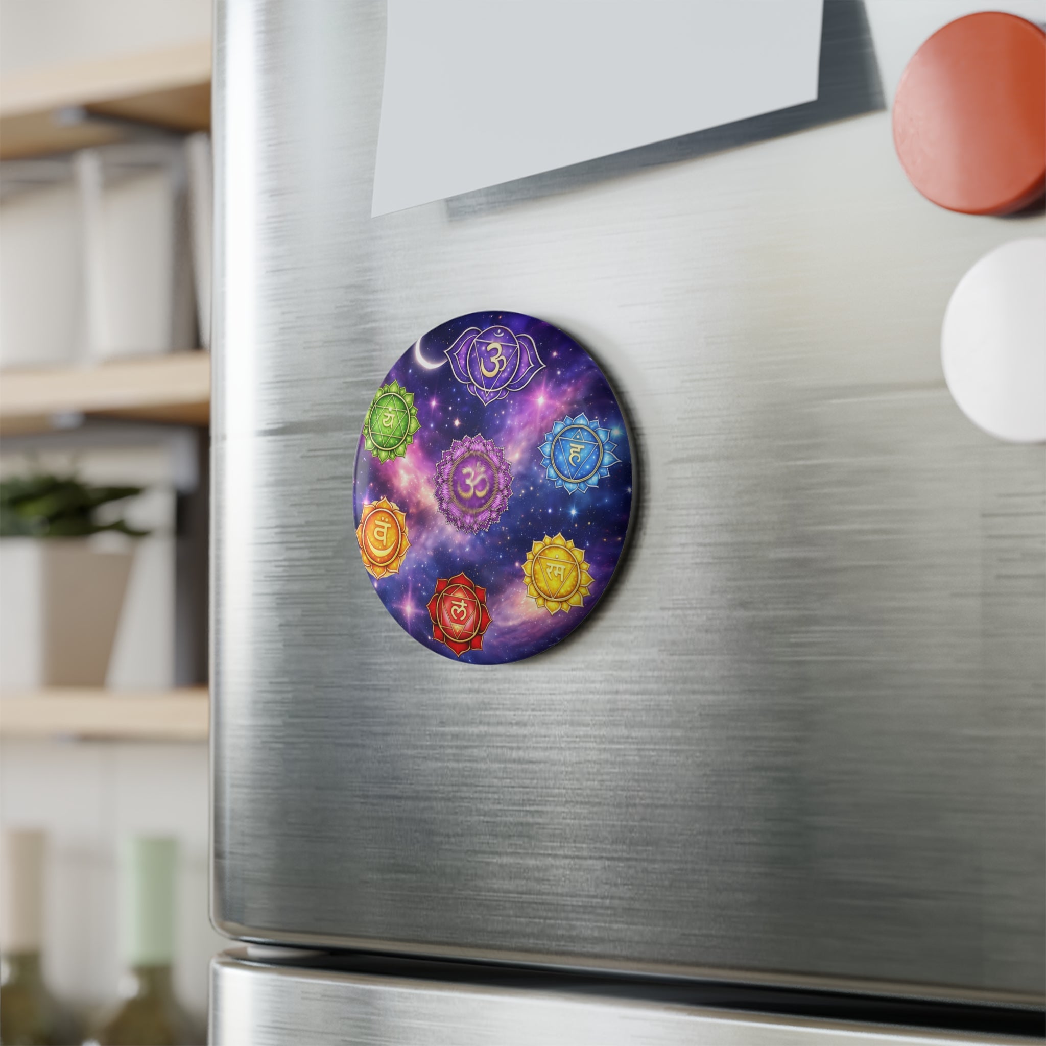 A small, jewel-like magnet that brings the chakra system into view. The crown chakra sits at the center, glowing amid a cosmic backdrop while the six remaining chakras orbit around it. It feels meditative and slightly otherworldly — a quiet visual anchor on a fridge, locker, or altar. For someone who arranges crystals, journals about energy work, or simply wants a moment of calm in a busy kitchen, this magnet nudges attention back to breath and balance. The rich, saturated colors and glossy mylar finish catch the light, while the slim metal shell and flat magnetic back keep it sitting flush against metal surfaces. Available as a single accent or a small set to pin intentions in multiple spaces.